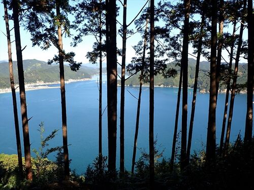 尾鷲トレイル全37km走破(予定) 対岸の左端はゴール(予定)地点 熊野古道も歩く ひたすらの階段に季節外れの大汗 長い道程も絶景に救われる 尾鷲市内